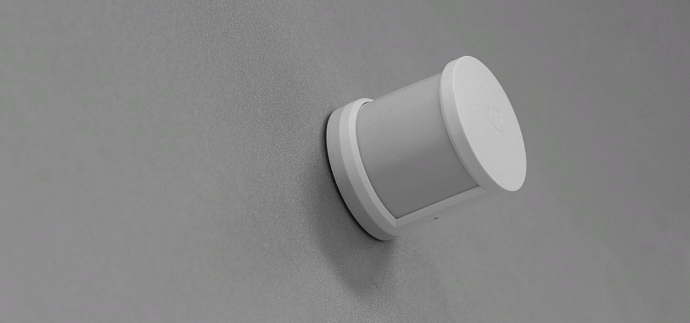 Датчик представляет собой цилиндр диаметром 30 миллиметров и высотой 33 миллиметра. Основная часть корпуса использует белый матовый пластик. На передней части находится закрытое матовой пленкой окошко сенсора. Слева от него — скрытая кнопка для подключения к базовому блоку. Небольшие размеры делают датчик незаметным для глаза, а его дизайн полностью впишется в интерьер любой комнаты.