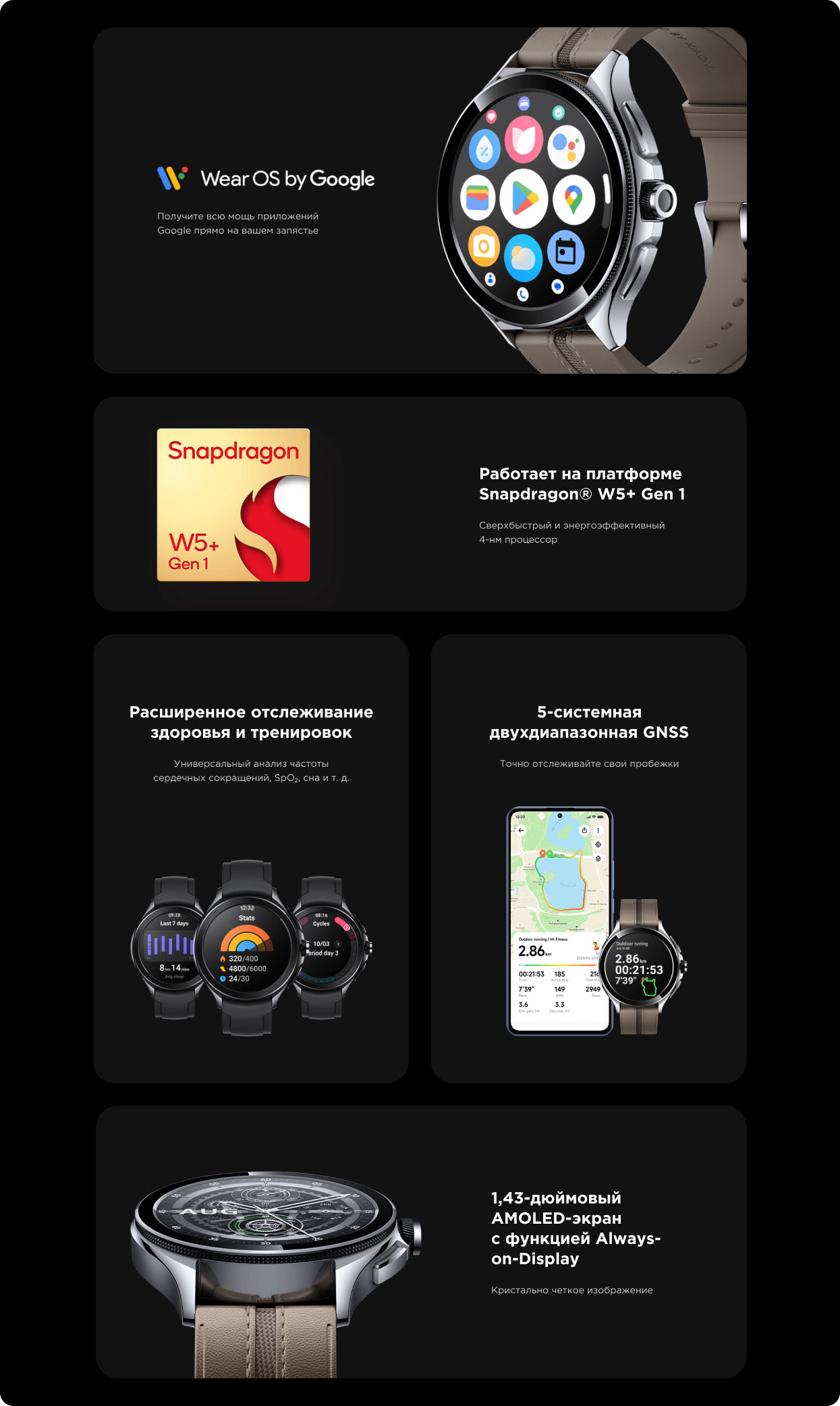 Особенностифункция Always-On Display, операционная система Wear OS, процессор Snapdragon W5+ Gen1