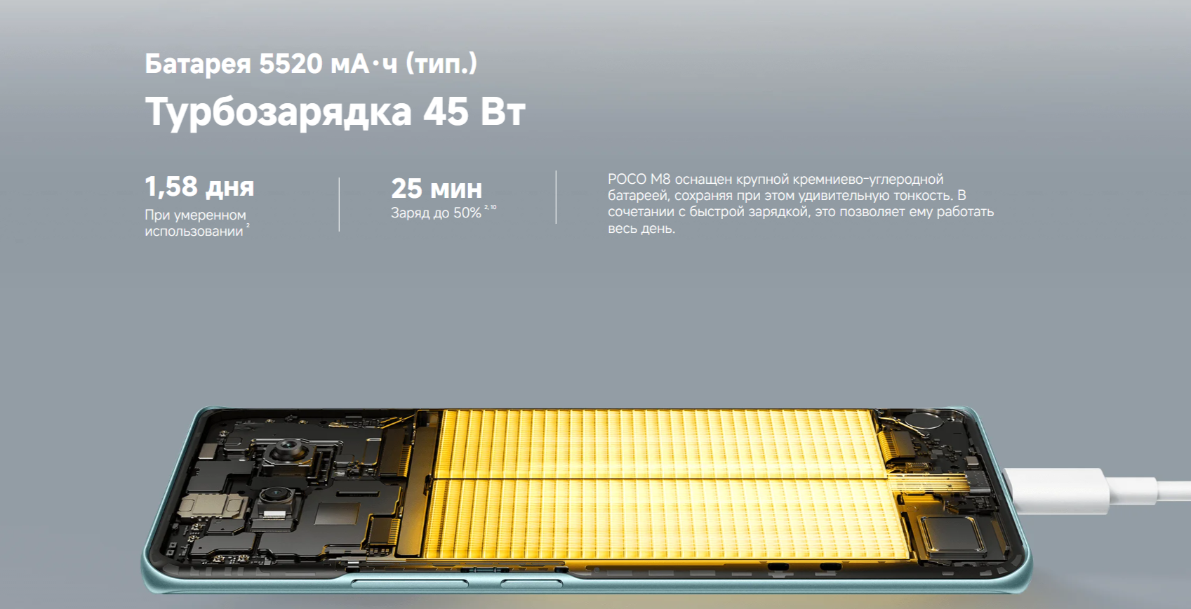 POCO M8 — это смартфон нового поколения, сочетающий рекордную производительность, исключительную автономность и элегантный дизайн в доступном сегменте.